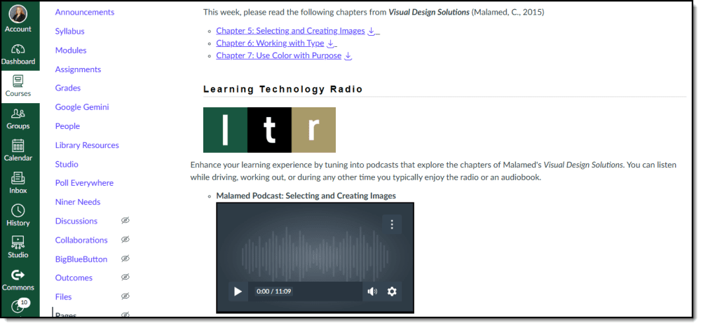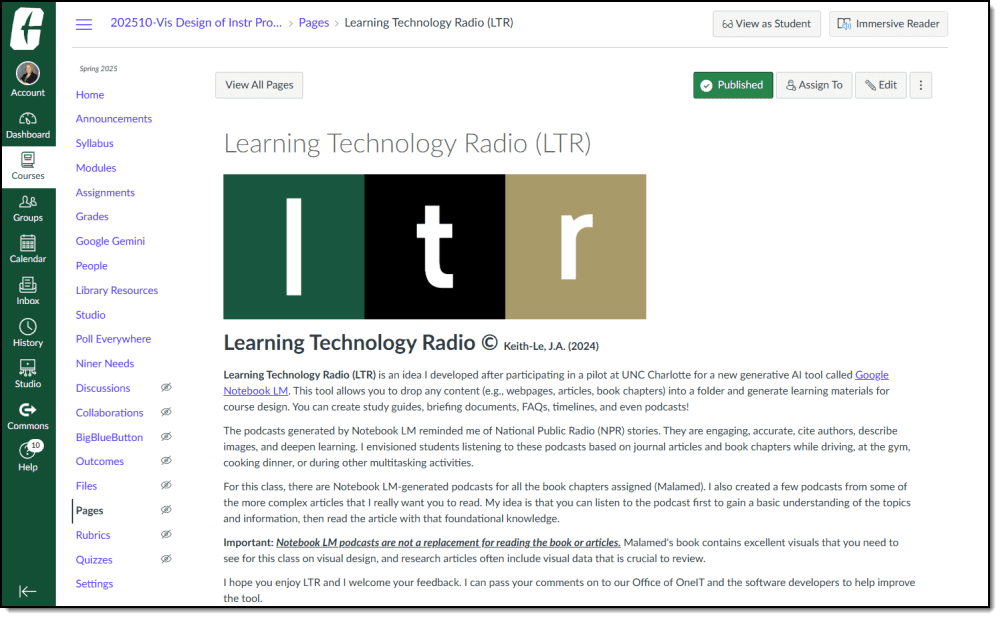 I was part of the Google Notebook LM pilot. One of Notebook LM’s features is the ability to input text (a PDF, website, or other word document) and have it transformed into a podcast, a conversation between two hosts. While testing Notebook LM and working on the redesign of my course, I produced the idea of Learning, Technology, Radio (LTR), which is a play on National Public Radio (NPR). While testing out the “podcast” feature that Notebook LM offers, I noticed it sounded like I was listening to a story on NPR. The university’s colors flashed in my mind and the letters “LTR.” At home, I quickly put together a logo for the fictitious radio station and began to think about how LTR could provide a supportive solution for students reading the course textbook, Connie Malamed’s Visual Design Solutions, and other course-related articles.