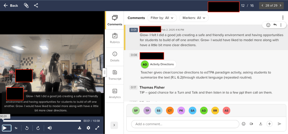 The image above displays GoReact’s capacity to allow users to comment with automatically time-stamped feedback, facilitating communication and reflection between the student teacher and the supervisor. There are also color-coded “markers” an instructor can create and implement to focus the student teachers’ attention to high-leverage practices. GoReact’s facilitation of the online observation process is—to say the least—essential to my colleagues and I, as we are the “HI” or Human Intelligence in the observation process.