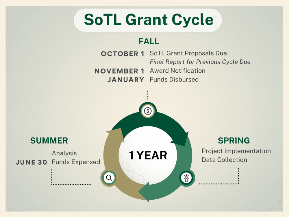 The SoTL Grant Cycle has a one year term that begins on October 1st, when SoTL Grant Proposals are due.